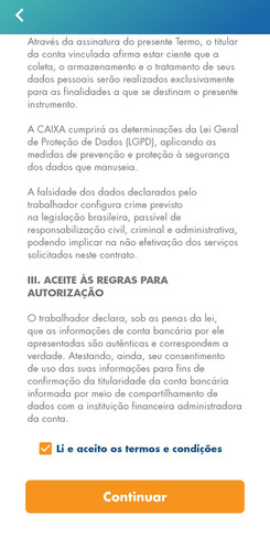 Baixe o aplicativo no seu celular, realize o login e aceite o contrato de prestação de serviços ao cidadão